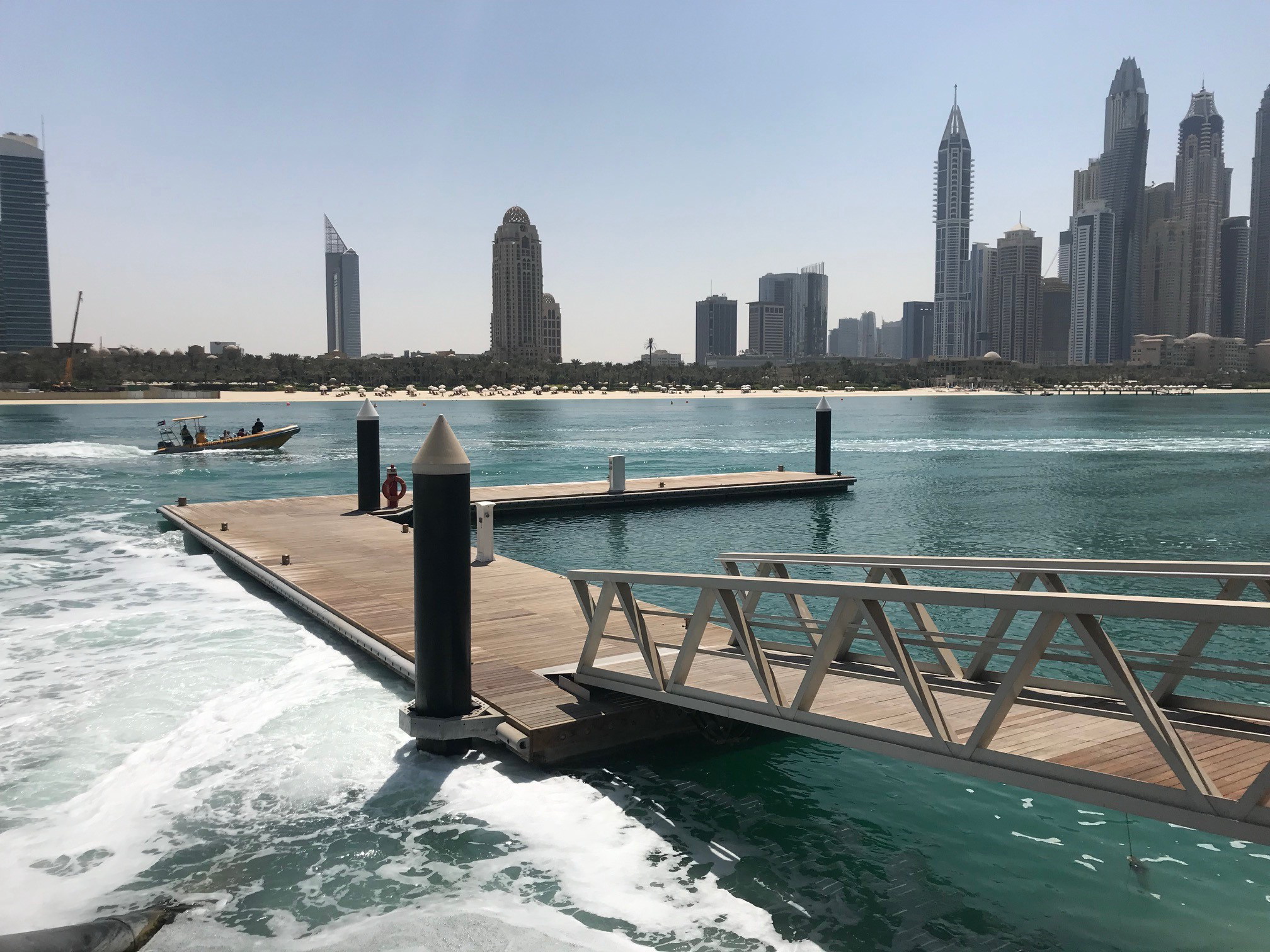 The Omniyat Jetty is located within the Palm Jumeirah Development in Dubai, UAE. The jetty is a drop-on and drop-off jetty to service the high-end residential development located on the trunk of Palm Jumeirah and is situated for use of vessels up to 30m in length which is typically categorized as a mega yacht. 2 boats is allowed to be moored on the jetty